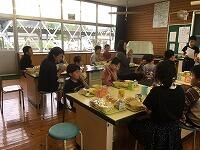 5月9日(木)は全校給食でした。岡元小学校では、毎月1回この全校児童と先生が一緒に給食を食べています。この日は、ALTの先生も入って、美味しく給食をいただきました。