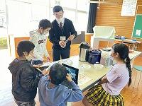 4年生の理科「ものの温度と体積」では、校長先生と一緒に学習をしています。実験をしたり、タブレットに記録したりしています。