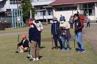 参観授業のあとはふれあいグランドゴルフを行いました。全校児童、保護者、高齢者クラブのみなさんとの、混合のチームを編成して行いました。