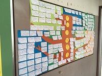 玄関の掲示板をリニューアルして、学級の写真と作品を展示しています。来校の際は、ぜひご覧ください。Pepperも作品を見ています。