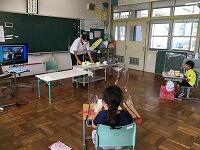 給食時間に画面(zoom)を通して初めて校長先生からお話がありました。お話は、明日からの生活や感染症予防についてでした。感染症を予防するために、これからも引き続き朝の健康観察、手あらい、消毒を行い、距離をとった生活を送ります。