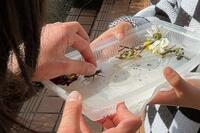 1年生の手には、虫かごのふたに乗せた小さなクワガタのメスがいました。