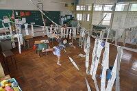 2年生の教室がいつもと違います。図工で、「つなげてつるして」の学習中です。新聞紙を切って、つるして・・・大きな作品ができました!