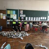 1・2年生の図工は、新聞を使って作品を作っています。みんなでたくさんの新聞を使って大きな物ができそうです。給食時間までに完成するでしょうか?