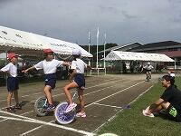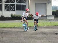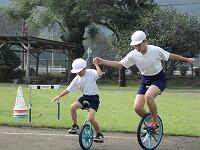 今日の全校体育では、前半は一輪車、後半はダンスの練習をしました。低学年は、高学年にリードしてもらい、手をつないで前進したり、小風車の技ができるようになって来ました。中学年は個人技を練習しました。