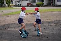 今年度は、一輪車の技を高め合うために一輪車発表会を2回計画しています。今日は、1回目の一輪車発表会が行われました。2~4年生はペアの技、5・6年生は、集団技を披露しました。4月に転校してきた児童も,