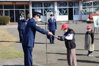 今日は、えびの警察署の方々が来校され、手上げ横断指定式が行われました。指定式では、えびの警察署長様からお話をいただき、代表児童がけんちゃんのアサガオがついた指定証を受け取りました。式後は、交通指導員の方々と手上げ横断の練習をしました。かけ声だけでなく、手をまっすぐあげ、車(道路)を見て、安全を確認しながら渡りました。