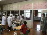 今日は、学校栄養職員の先生に来校していただきました。準備・配膳・片付けの様子を見ていただき、1年生と会食、放送指導をしていただきました。毎年来校していただいています。子どもたちや職員と献立の話をしたり、給食時間の様子を見ていただくことで、献立や給食指導に生かしていただくよい機会になっています。