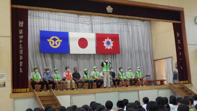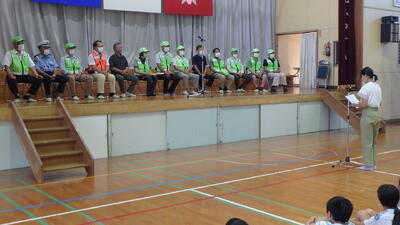 暑い日も寒い日も、子供たちが安全に登下校できるよう、交差点などで交通指導を行っていただいている見守り隊の方々に感謝の手紙を手渡し、児童代表がお礼のことばを伝えました。