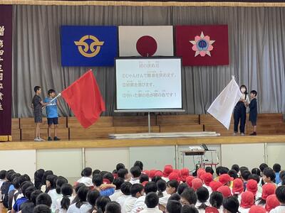 10月に入り、少し涼しくなってきました。体育館内での熱中症の危険性も低かったことから、10月の全校朝会は体育館で行いました。