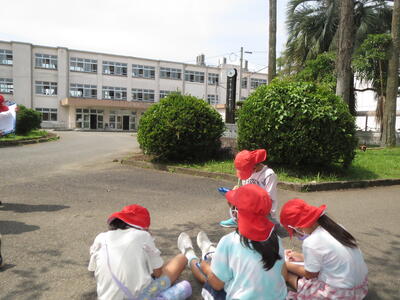 今日は2年生が生活科の授業の一環で「町探検」に行ってきました。いつも通っているけど、入ったことのないお店や数年後に通うであろう妻中学校を見て回りました。