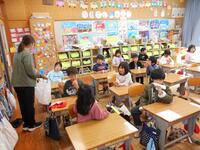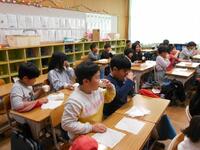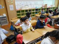 担任からの説明の後、洗口液を口に含み音楽に合わせて