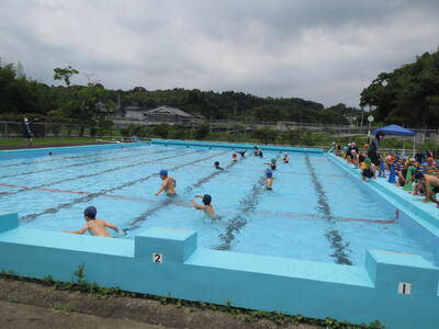 3年生は今年初めて大きいプールに入りました。身長がギリギリで、つま先立ちで必死に跳んでいる児童もいました。