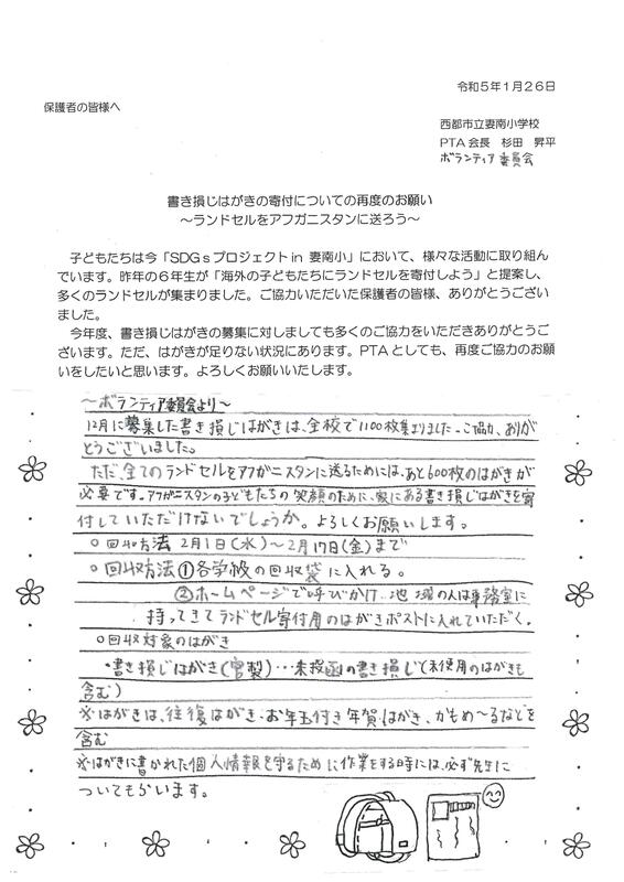 ボランティア委員会では、書き損じはがきを集めてランドセルをアフガニスタンに送るプロジェクトを行っています。