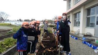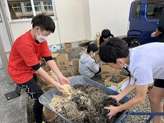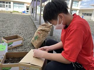 6年生が中庭で何か作業をしています。