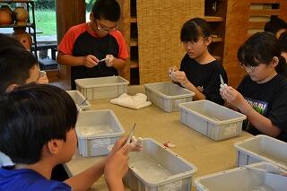 博物館に着いたら、体験館へ移動し、まが玉づくりに取り組みました。