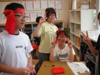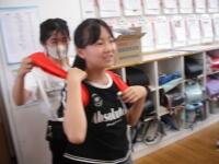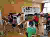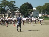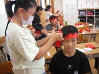 5年生は、運動会で披露する「臼太鼓踊り」のはちまきとたすきの結び方を練習しました。