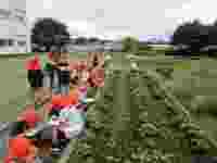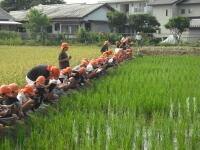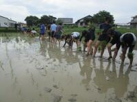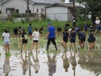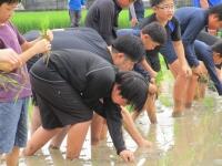 本日、5年生が田植えを体験しました。田植えが初めてという児童も多く、最初はぎこちない手つきでしたが、徐々にコツをつかみ、手際よく植えられるようになっていきました。