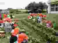 5年生が稲刈り体験を行いました。子どもたちは鎌を使って稲を刈り、ひもで束ねて干す作業に挑戦しました。はじめはぎこちなかった手つきも、妻南地域づくり協議会のみなさんの丁寧なご指導のおかげで、次第に上手になっていきました。