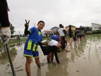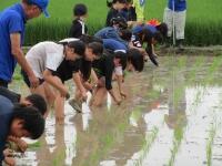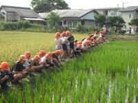 子どもたちは泥の感触を楽しみながら、笑顔で取り組んでいました。田んぼは学校のすぐ目の前にあり、これから稲の成長の様子を観察したり、お世話をしたりしながら、たくさんのことを学んでいってくれることと思います。