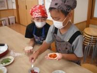 3年生が自分たちで育てたピーマンを使って、簡単な調理活動を行いました。今回は、「餃子の皮ピザ」に挑戦! 餃子の皮にソースや具材をのせてフライパンで焼くだけの手軽なレシピですが、子どもたちはとても楽しそうに取り組んでいました。
