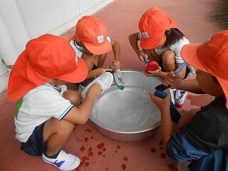1年生は、生活科の学習でシューズ洗いをしました。洗う前に自分のシューズの汚れを確認して、ブラシでごしごし磨きました。出てくる汚れにびっくりしながら白くなるまで磨きぴかぴかになりました。