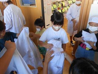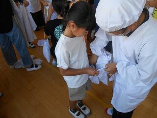 先週から1年生も給食当番を始めました。初めてでまだまだ慣れるまでには時間がかかりますが、運び方や注ぎ方、給食着の畳み方などを6年生に教えてもらいながら毎日がんばっています。