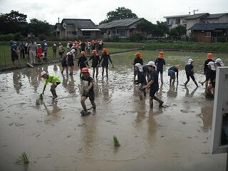 例年、本校では5年生が田植えを行っております。社会や総合的な学習の時間とも関連させながらの学習です。