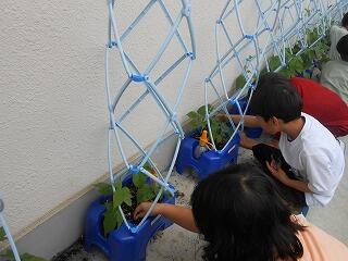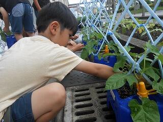 1年生は、生活科で、あさがおを種から育てています。ツルも少しずつ育ってきており、先日支柱を立てました。そして、昨日は肥料をまきました。これから大きくなって花が咲くのが楽しみです。