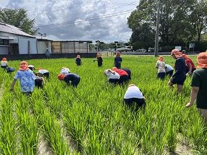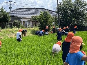 5年生は、田植えをした田の草ぬきを行いました。気温も高く、短い時間での活動でしたが、おいしいお米を作るために一生懸命取り組んでいました。