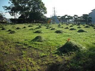 今回は、運動場や校門周辺の草刈りを中心に行いました。夏の間、元気に伸びた草を刈ったり抜いたりしながら草を集めていくと、なんと、下の写真のような草の山ができました。まるで、何かの芸術作品のようにも見えます。
