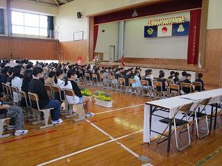 式の中では、1年生の入学を祝うお話をいただきました。西都市教育委員会教育長からは「3つのありがとう」について告示があり、友達、家族、地域の方に感謝の気持ちをもってほしいとのことでした。PTA会長のお話では、「ドキドキドン!1年生」の歌を会場の皆さんと一緒に歌う場面があり、とても和やかな雰囲気になりました。6年生児童は、学校生活の楽しいことについて教えてくれました。
