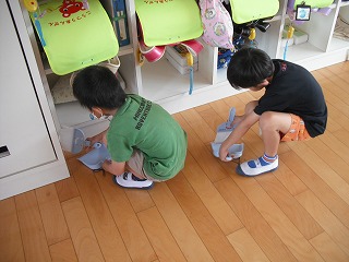 子どもたちは初めての昼休みにわくわくしていましたが、残念ながら暑さと雨で外に出られず、お絵かきや粘土遊び、絵本を読んで過ごしました。その後の清掃も1年生は担任の先生の指示に従い、積極的に行っていました。