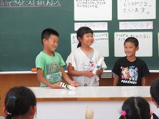 2年生は生活科で、「動くおもちゃ」作りをしています。この日のめあては「つくったおもちゃをはっぴょうして、かいりょうできるところを話しあおう。」です。グループごとに作ったおもちゃを紹介し、困っていることを伝え、みんなでその解決策を考えていきました。