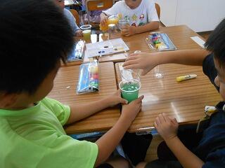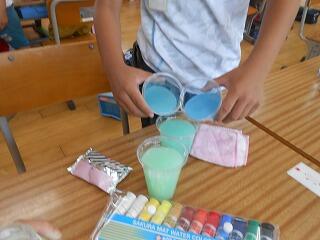 本日1年生が、図工の時間に絵の具を使って色水作りをしました。色水はペットボトルを使ってシャカシャカ振って、自分の選んだ色で作りました。友だちの色水と混ぜてどんな色になるのか実験しながら「カルピスみたい!」「いろんな緑ができた!」と楽しんでいました。授業だけでなく昼休みも友だちの色水と比べたり振ったりして子どもたちなりの楽しみ方を見付けて遊んでいました。