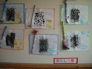 6年生は、自分たちで筆を作製してそれで模様を描く学習を行っていました。