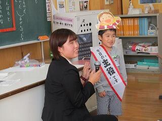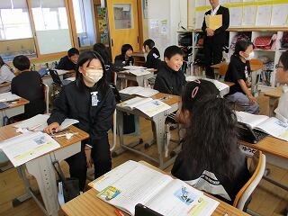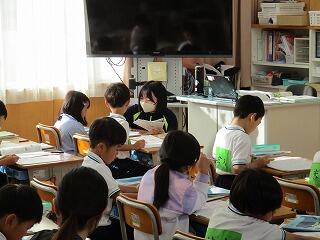 低学年を中心として学級に入り、授業中に丸付けをしたり図画工作科のアドバイスをしたりして、ミニ先生として活躍していました。初めは緊張の面持ちだった中学生ですが、小学生の子どもたちが積極的に話しかけたことで緊張がほぐれ、笑顔が見られるようになりました。