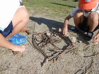 少しずつイチョウの葉も黄色に染まる紅葉の季節になりました。1年生が、そんな秋にぴったりの図画工作「ならべてならべて」を行いました。落ち葉や枝、石を使って並べ、自由に作品を作りました。運動場に生えている大きなイチョウの木の下から落ち葉を持ってきては、ハートや長い列を友だちと協力して作っていました。