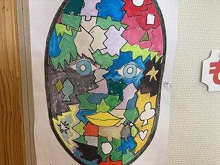 3年生の階段には、図工で描いた作品が掲示されていました。