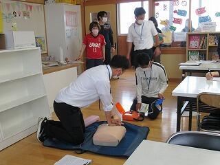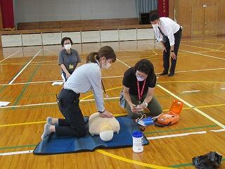 子どもたちが下校後、職員は体育館に集まって救命救急法の研修会を行いました。