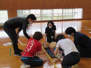 養護教諭の指導の下、各グループで心肺蘇生法の訓練を実施しました。
