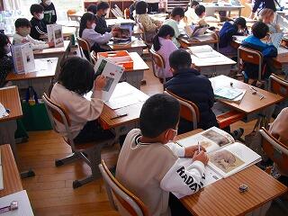 1年生の教室では、自分の紹介したい動物について本を使って調べていました。