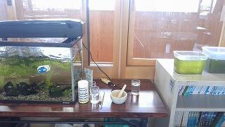右の小さな水そうには子メダカがいます。元気に育ってほしいですね。