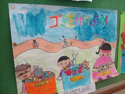 環境問題についての学習の一環・・・「ゴミ」についてのさまざまな呼びかけをポスターで表現していますよ。
