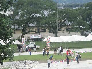 保護者と職員での準備・・・幸い、雨はやんでいます。