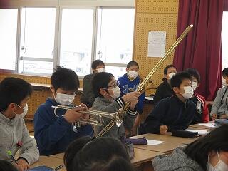トランペットとトロンボーンをもってみました。・・・興味津々の様子でしたよ。