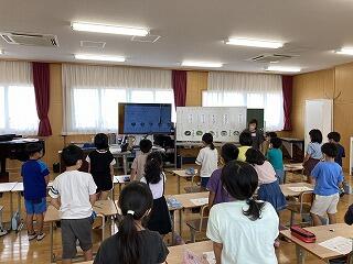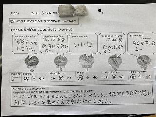 音楽の授業 投稿日時 : 2022/09/14 syokuin 音楽室から ♪あれ、まつむしがないている♪ の歌声が聞こえてきました。 2年生が音楽の授業に取り組んでいるようです。 「ようすをおもいうかべて工夫して歌おう」というめあてのもと授業が行われていました。 虫たちがどんな会話をしているのか想像しながら歌の歌い方を工夫していました。 授業後のワークシートです。 自分達で歌い方を工夫して授業に取り組むことができたようです。