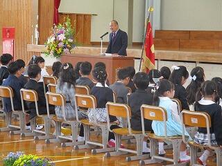 式の中では、1年生の入学を祝うお話をいただきました。西都市教育委員会教育長からは「3つのありがとう」について告示があり、友達、家族、地域の方に感謝の気持ちをもってほしいとのことでした。PTA会長のお話では、「ドキドキドン!1年生」の歌を会場の皆さんと一緒に歌う場面があり、とても和やかな雰囲気になりました。6年生児童は、学校生活の楽しいことについて教えてくれました。