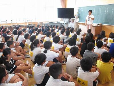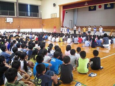 夏休みに行われた西都市水泳大会で優秀な成績を収めた本校児童の表彰式が行われました。全校みんなでその健闘を拍手でたたえました。