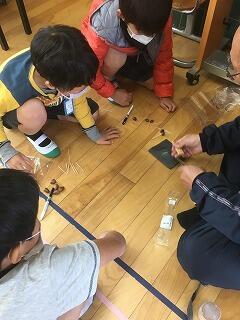 地域の方にどんぐりゴマの作り方を教わっていました。自然のものを使って昔ながらの遊びにふれ、子どもたちは興味津々でした。